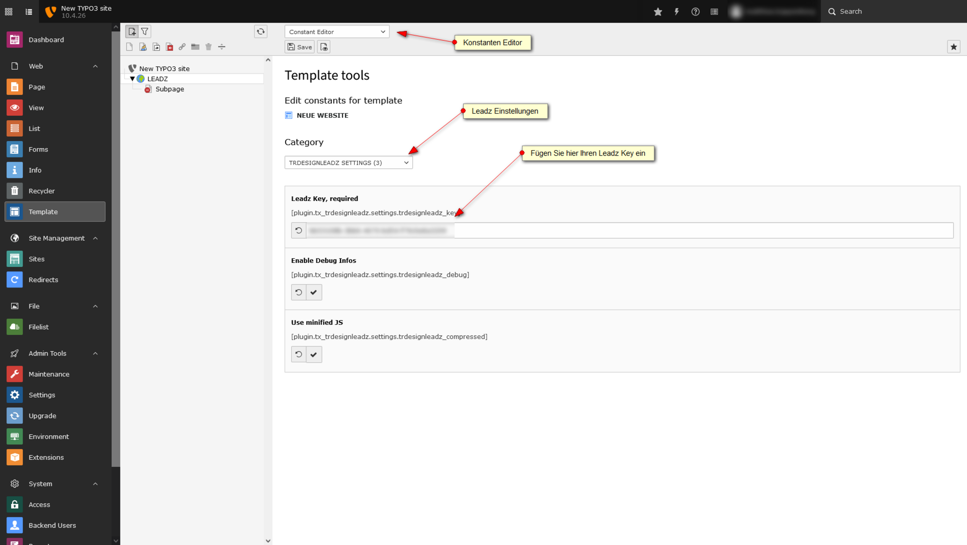 Das Extension Setup sollte nach der Installation eingebunden werden und Sie müssen Ihren Leadz Key hinterlegen.